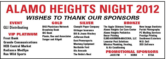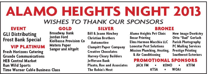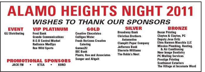 The sponsorships listed below do not reflect the hundreds of individual and organizational volunteers that assist in putting on Alamo Heights Night. Without the assistance of these sponsors and community volunteers, Alamo Heights Night would not be as successful as it is. Individuals and organizations interested in sponsoring or volunteering should call 210-273-1961 or email rick@ahrotary.org.